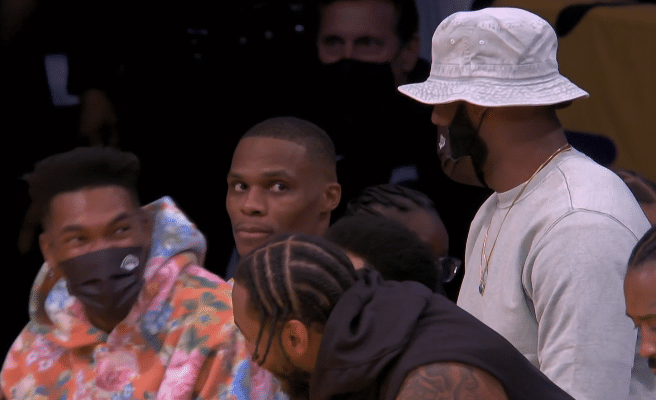 末节比赛彻底变成练兵,镜头给到湖人替补席,当时詹姆斯和蒙克聊天,后者满脸笑容十分开心,此时威少也在镜头中,一脸落寞很不开心;很明显,威少对自己的表现很不满意,两场比赛19中4且出现15次失误,如此状态确实太差了。