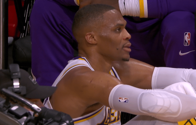 截止到目前,威少身披湖人0号战袍打了两场比赛,首战7投1中仅2分7篮板4助攻以及6失误,第二场12投3中仅仅只有8分却出现9次失误,两场比赛19投4中出现多达15次失误,进攻端表现不佳,失误多的有些离谱;其中有一次失误,威少运球刚过半场就被造犯规,此时他一脸无奈。