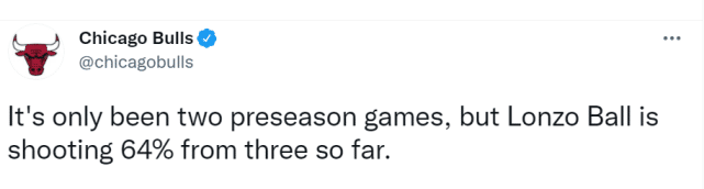 360直播吧10月11日讯 ,芝加哥公牛更新官方社媒,晒出了球哥(朗佐-波尔)的照片,并配文写道:“刚打了两场季前赛,但朗佐-波尔的三分命中率高达64%。”