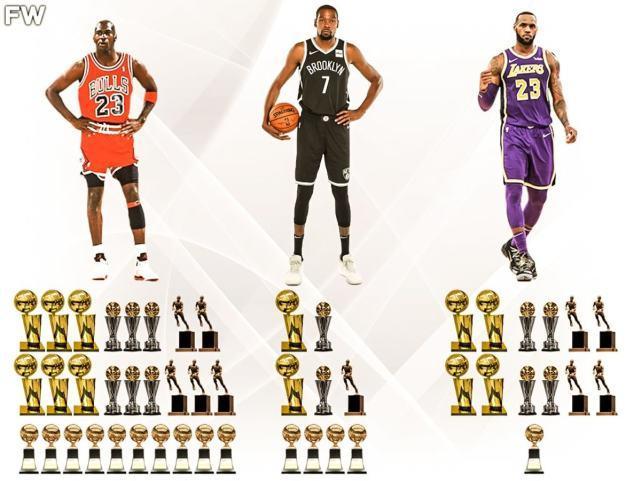 乔丹生涯场均30.1分6.2篮板5.3助攻,夺得6座总冠军。生涯至今,詹姆斯场均27分7.4篮板7.4助攻,夺得4座总冠军。杜兰特场均27分7.1篮板4.2助攻,夺得2座总冠军。