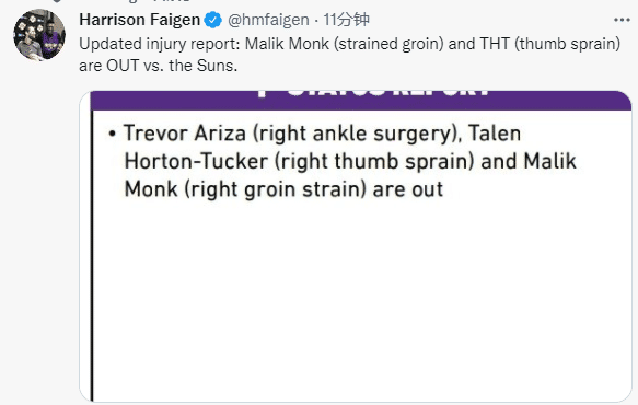 360直播吧10月10日讯 ,洛杉矶湖人队最新伤病报告出炉,据名记Harrison Faigen报道,明天对阵太阳,除了阿里扎(右脚踝清创手术)之外,塔克和蒙克也将缺席本场比赛,塔克遭遇右手拇指扭伤,蒙克则是遭遇右腹股沟拉伤。