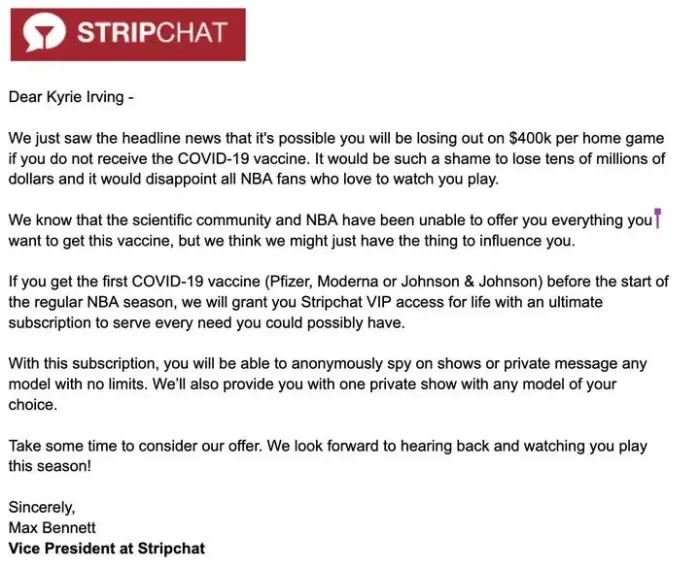 硬的不行来软的,向来热心肠的美国成人网站放大招,承诺欧文若在常规赛开始前成功接种第一剂疫苗,将为他送出终身免费VIP卡,同时给欧文奉上一场私人秀,可以指定任意模特。