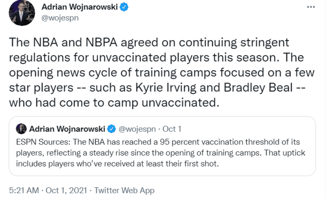 随着常规赛季的临近,NBA球员接种比例正在继续提升,名记沃纳罗斯基报道称,目前联盟的接种新冠疫苗比例已经达到95%,其中包括已经注射一针疫苗的球员。沃纳罗斯基同时透露,联盟和工会已经同意继续执行对未接种疫苗球员的严格限制措施。