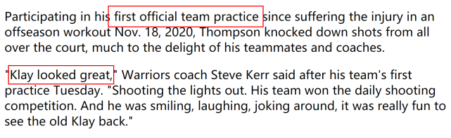 “克莱回到场上,让每个人都兴奋不已,”科尔说,“他几乎完成了今天的所有训练。我们没有打对抗赛,还没有很多对抗,但克莱对自己能打球感到开心,我们也都开始他能参与其中。我们的能量很棒。”汤普森能参加球队合练,水花兄弟又可以合体打球了。好消息是,格林也回到勇士的训练场了,在今天训练结束后,格林还在采访中表示不会逼维金斯接种疫苗,并强调维金斯的身体属于他自己。