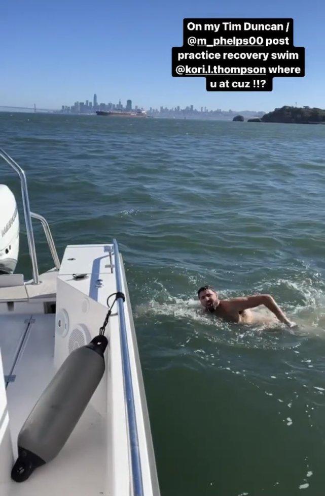 就在今天训练结束后,汤普森更新社媒,晒出了自己在海中游泳的一幕。他游到自己的船边,爬上来后大吼一声,神清气爽。克莱真是喜欢水上运动,训练后游个泳对他来说是最好的放松。