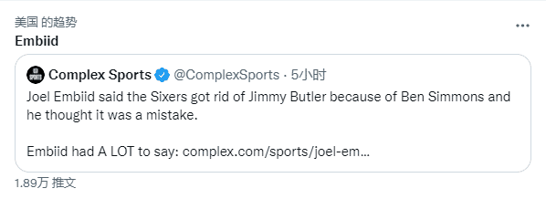 北京时间10月1日,恩比德不满西蒙斯的言论引热议,他公开表示当初76人签下霍福德并且放弃巴特勒的原因都是为了西蒙斯,时至今日我仍觉得这是一个错误;恩比德言论冲上推特热搜引热议,名嘴直呼他和西蒙斯的关系彻底结束了。