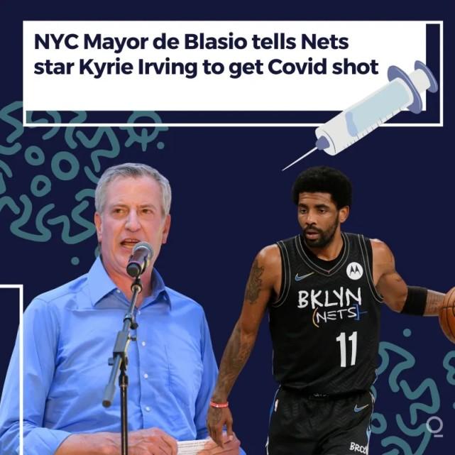 纽约市长Blasio在采访中说道:“我是篮网的球迷,欧文的粉丝。我想劝说他打疫苗吧。你的球迷想看你打球。我们都想让你回来。有些球队都100%全员接种了,给所有人树立了很好的榜样。”