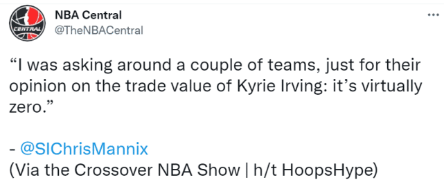 360直播吧9月30日讯 ,据《体育画报》记者Chris Mannix的报道,凯里-欧文的交易价值基本是零。“我问了几支球队,就是看看他们认为欧文的交易价值有多少:基本上是零。他的新赛季薪水3500万美元,并且他非常难以捉摸。”