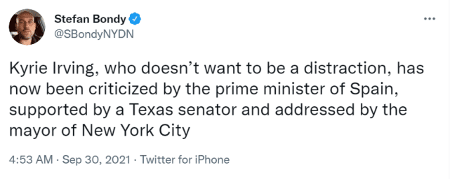 尼克斯记者Bondy貌似对欧文的做法感到不满。他在社媒上写道:“凯里-欧文,一个不想分散球队注意力的人,目前已经被西班牙首相批判过,被德州参议员支持过,现在又被纽约市长点评。”该记者写道。
