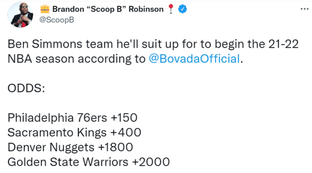 NBA记者布兰登-罗宾逊晒出了西蒙斯下家的最新赔率。2021-22赛季开始时,西蒙斯将身穿哪支球队的球衣?目前排名第一的是76人(+150)。这意味着大家认为他在新赛季开始前被成功交易的可能性不是太大。排名第二的是国王(+400),掘金(+1800)和勇士(+2000)也都在榜上,但可能性明显不如国王。