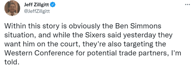 对老鹰的系列赛中,西蒙斯场均9.9分6.3篮板8.6助攻,投篮命中率60%,但罚球命中率只有33.3%。西蒙斯是一个出色的传球手和防守者,但他的投篮能力和意愿不足,三分球和罚球表现都不好。76人对西蒙斯的要价很高,8月份的一篇报道指出,76人想要用西蒙斯换回4个首轮签+1个全明星球员,但没有球队愿意给出这样的筹码,如今,76人也不愿意降低报价,他们仍在和多支球队进行谈判。