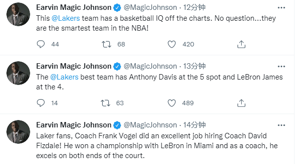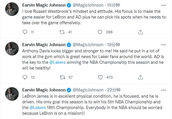 360直播吧9月29日讯 ,湖人正式举办新赛季媒体日,詹姆斯、浓眉和威少等球员集体拍摄定妆照,三巨头正式亮相,新赛季带队冲击总冠军。对于湖人全新的冲冠阵容,湖人名宿魔术师发推说了很多话,盛赞湖人三巨头,直言湖人是全联盟最好且最聪明的球队。