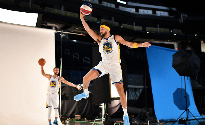 如今克莱回归和克莱拍摄定妆照,其中水花兄弟终于合体,他们一起拍摄的照片被认为是最佳瞬间。库里和克莱同时出现在镜头面前,库里做出扣篮动作,克莱则是上篮的动作,两人同框。