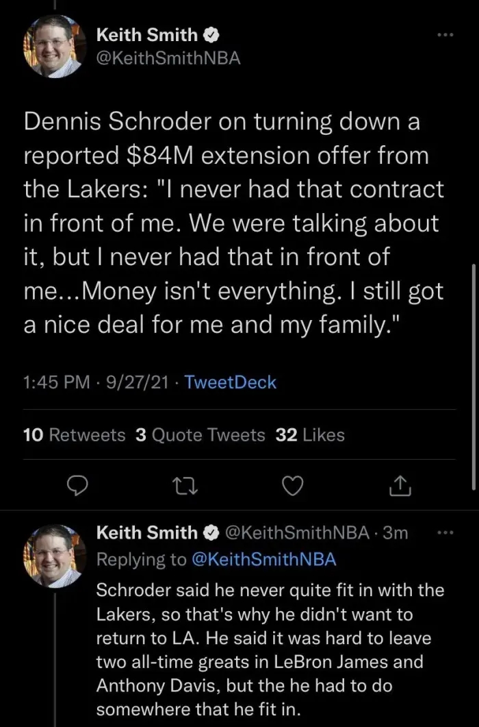 在媒体日上施罗德澄清了所谓的“美媒报道”他表示:这份合同(4年8400万)从来没有真正放到我的面前,我们谈论过它,但是合同从来没有出现过了,钱不是一切,对我和我的家庭来说,我仍然得到了一份不错的合同。同时我一直没能适应沃格尔的战术体系,我和湖人不合适,离开詹姆斯和AD很难,但我必须找一个适合我的地方。