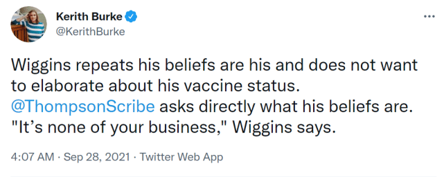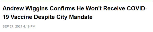 “现在我想让一切保持隐私状态,任何与疫苗相关的问题,”维金斯在采访中说道,“我的球队,我爱他们,如果他们想说些什么,那没关系。”