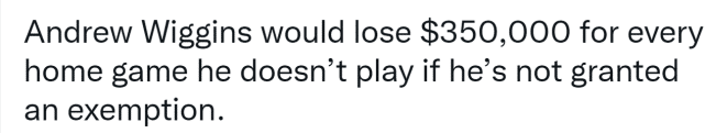 360直播吧9月28日讯,勇士球员维金斯在媒体日采访中谈到了疫苗话题,从目前的情况来看,他仍不打算接种新冠疫苗。根据旧金山卫生防疫规定,在他完成接种前,将无法参加勇士的主场比赛。日前,NBA官方已经拒绝了维金斯的宗教豁免申请。