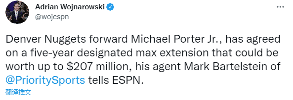 360直播吧9月28日讯 ,据ESPN名记沃纳罗斯基报道,小波特已经同意和掘金续签最高5年2.07亿美元的顶薪大合同,不过前提是小波特新赛季要入选最佳阵容,否则他的合同将变成5年1.72亿美元,成为东契奇、特雷-杨和雷霆球员亚历山大之后,08届新秀中第四位续签大合同的球员。