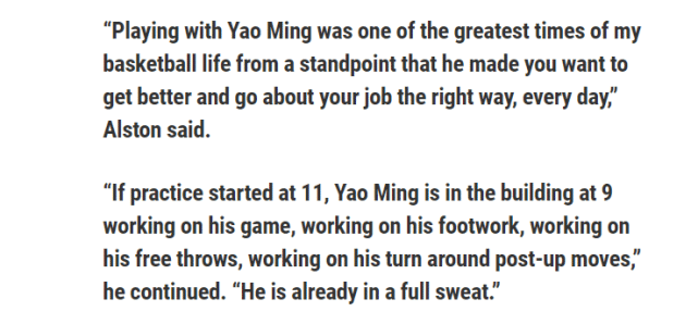 “和姚明一起打球是我篮球生涯中最棒的时光之一,他让你每天都想要变得更出色,每天都以正确的方式去做你的工作。”阿尔斯通说道,“如果训练是11点开始,姚明9点就已经在球馆里开始训练了,练习他的脚步、罚球、低位转身动作。”