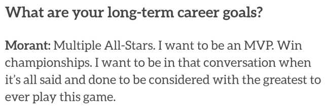 至于职业生涯的长远目标,莫兰特也有自己的憧憬。“多次入选全明星。我想成为一个MVP,赢下总冠军。当我退役时,我希望自己能进入最伟大球员的讨论之中。”
