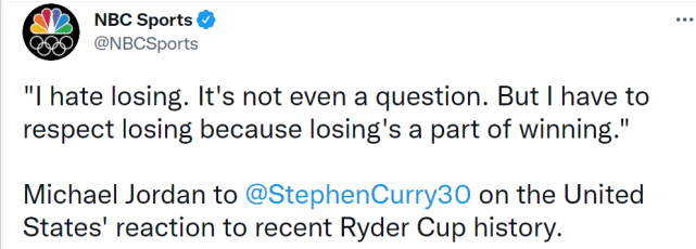 360直播吧9月27日讯 ,第43届莱德杯高尔夫球赛在美国呼啸峡球场落幕。美国队以19-9的总比分轻松战胜欧洲队,时隔五年夺回莱德杯。乔丹和库里,不同时代的两大巨星,都来到现场观战这次比赛,NBC体育晒出了两人的谈话内容。