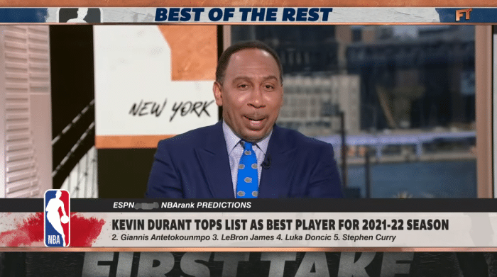 360直播吧9月26日讯 ,权威体育媒体ESPN此前评选了新赛季百大球员,其中篮网巨星杜兰特力压上赛季FMVP字母哥排在第一。而近日,ESPN王牌评论员斯蒂芬A史密斯在节目中谈到了杜兰特与字母哥。