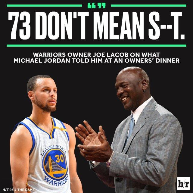 乔丹和库里之间有什么交集吗?有球迷表示,乔丹当年率领公牛创下的72胜纪录,就是被库里领军的勇士所打破,遗憾的是那年库里虽然拿到73胜,却没能赢下总冠军。有趣的是乔丹还曾爆粗口调侃勇士老板拉科布:“73胜没啥意义。”