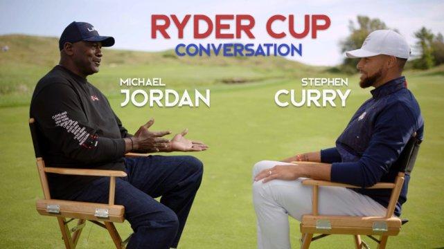 和库里一样,乔丹也是一位高尔夫球爱好者,时不时在篮球场外露一手。画面上,乔丹和库里在高尔夫球场上面对面交流。这是在威斯康星州的呼啸峡谷举行的莱德杯高尔夫球对抗赛,库里和乔丹都参与其中,并有所交流。