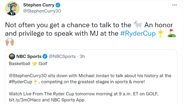 360直播吧9月26日讯 ,NBC体育预告明天将播出库里和乔丹对话的节目。库里在社媒上转发了这一动态,并配文写道:“和GOAT(史上最佳)交流的机会可不常有,太荣幸能和乔丹在莱德杯上聊聊天。”