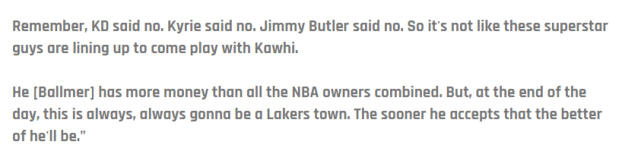 360直播吧9月26日讯 ,名嘴香农-夏普在最新一期的UNDISPUTED节目上谈到了快船。他并不看好快船的未来,并在节目上回应快船老板鲍尔默:“洛杉矶永远是湖人的城市。”