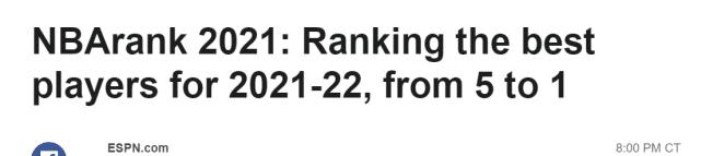 360直播吧9月25日讯,近日《体育画报》和ESPN都排出了新赛季的百大球星,其中前十的排名最引人关注,看一下两大美媒给出的排名!