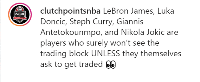 360直播吧讯 当今联盟中,有哪些球星是真正的非卖品?北京时间9月4日,美媒clutchpoints列出了现役五大非卖品,他们分别是詹姆斯、库里、东契奇、字母哥和约基奇。“除非他们自己要求,否则这些球员是不可能被球队交易的。”美媒评价道。