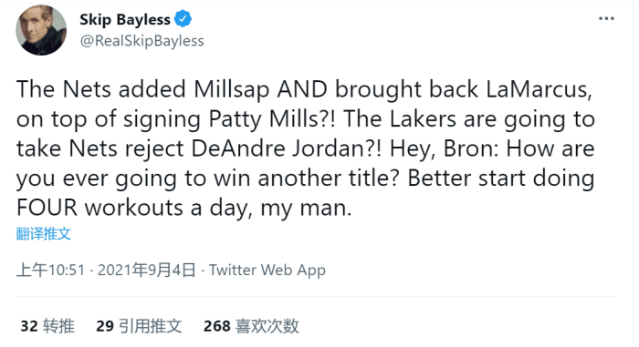 值得一提的是,著名记者兼全美第一詹黑的贝勒斯也是在湖人篮网这波操作后发表了自己的看法:网队在签下帕蒂米尔斯的基础上增加了米尔萨普并带回了阿尔德里奇?!湖人要签篮网不要的德安德鲁乔丹?嘿,勒布朗:你怎么可能还会赢得另一个总冠军?伙计,你最好开始每天进行四次锻炼。