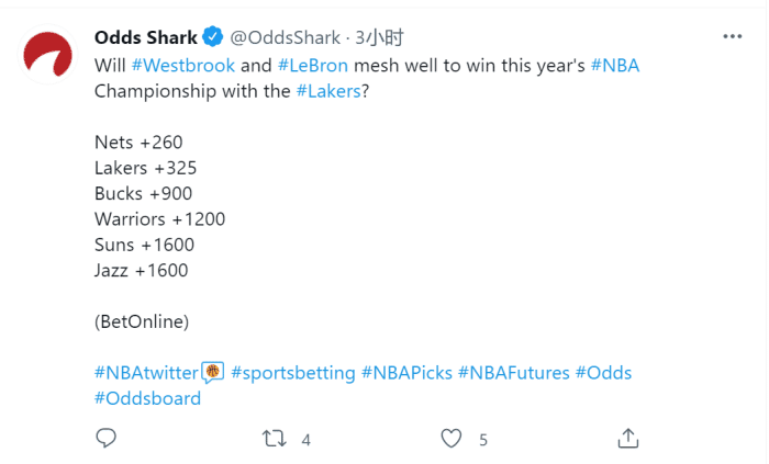 言外之意,贝勒斯认为湖人新赛季无法击败篮网。此前有美媒更新了新赛季的夺冠赔率,篮网也是力压湖人高居第一,卫冕冠军雄鹿位居第三,勇士排在第4,太阳和爵士则是并列第5位。