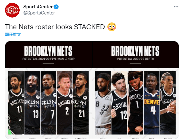 美媒SportsCenter预测篮网首发阵容——杜兰特、哈登、欧文、格里芬和阿德,替补席有米尔斯、乔-哈里斯、米尔萨普、小布朗等人,直言篮网阵容太有深度;篮网已经打造超级豪华的阵容,交易小乔丹从而得到奥卡福和敦布亚,你觉得篮网三巨头新赛季能带队夺冠吗?