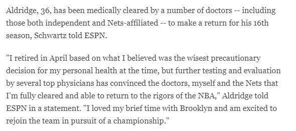 360直播吧9月04日讯,7届全明星阿尔德里奇正式重返NBA,据ESPN名记沃纳罗斯基报道,36岁的阿德同意1年260万美元签约篮网;5个月前,阿德因心脏问题宣布退役,如今他又回来了。