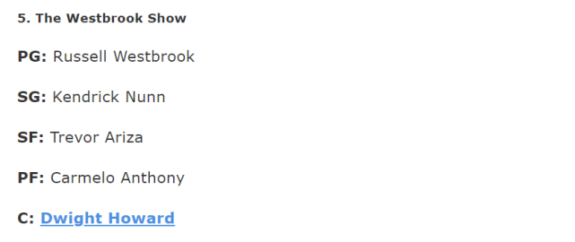 控卫:威斯布鲁克;分卫:纳恩;小前:阿里扎;大前:安东尼;中锋:霍华德