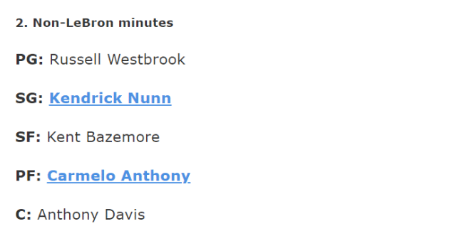控卫:威斯布鲁克;分卫:贝兹莫尔;小前:阿里扎;大前:詹姆斯;中锋:浓眉