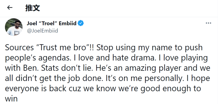 在今年季后赛对阵老鹰的一场比赛中,恩比德曾抱怨西蒙斯空位不敢出手,当时很多人都把这视为大帝不想再跟西蒙斯合作的信号。但在北京时间的昨天晚上,情况似乎又发生了转变,恩比德在社媒上发声:我喜欢和西蒙斯一起打球,数据不会说话,西蒙斯是一个不可思议的球员,我希望西蒙斯和其他球员新赛季可以回归球队!