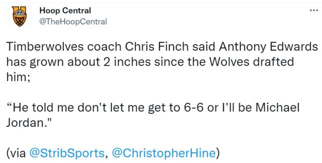 360直播吧9月02日讯 ,森林狼主帅克里斯-芬奇在接受采访时聊到了爱德华兹,表示他选秀身高是193cm,这一年涨高了5公分,现在是198cm!