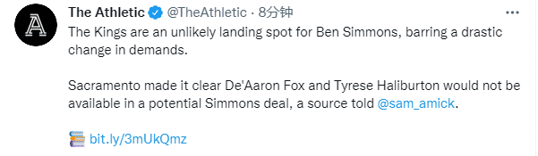 360直播吧讯 北京时间9月2日,76人和国王关于西蒙斯的交易几乎谈崩,名记SamAmick曝光两队谈判的细节,国王队明确表态,拒绝交易福克斯和哈利伯顿两大新星,该名记还表示:除非76人的要价大幅度下降,否则西蒙斯短期内不会被交易到国王。
