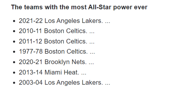2003-04赛季的湖人,同为全队累计41次入选全明星,包括卡尔-马龙的14次,奥尼尔的11次,佩顿的9次,科比的6次和霍拉斯-格兰特的1次。凑足四巨头的湖人,常规赛56胜26负,和10年后的热火类似,他们也打进了总决赛,但1-4不敌活塞,无缘总冠军。