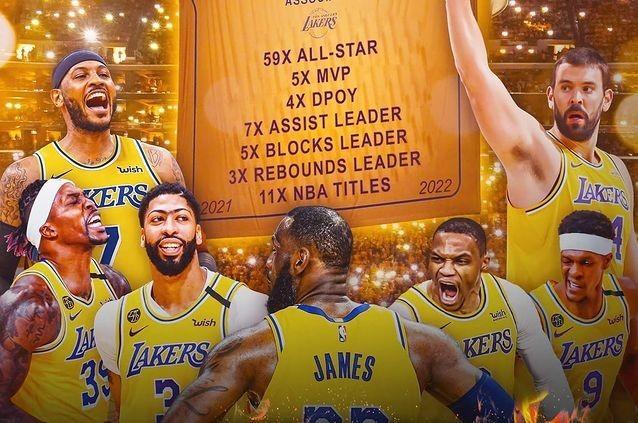 湖人还没正式开启新赛季,他们已经创造了一项历史第一。2021-22赛季的湖人,一共拥有7位曾入选全明星的球员,累计入选全明星次数是59次,创单支球队历史新高。这59次包括詹姆斯的17次,安东尼的10次,威斯布鲁克的9次、浓眉的8次、霍华德的8次、朗多的4次和小加索尔的3次。这支湖人的目标无疑是总冠军,至于能否实现,还要等到明年揭晓答案。