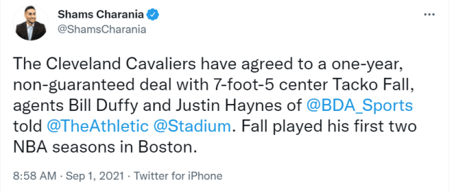 360直播吧9月01日讯 ,据名记查拉尼亚报道,克里夫兰骑士已经和身高7英尺5英寸(2米26)的中锋塔科-法尔签下一份1年无保障的合同。法尔的经纪人达菲和海恩斯确认了这一消息。法尔前两个赛季效力于凯尔特人,如今,他将在骑士开启职业生涯的新篇章。