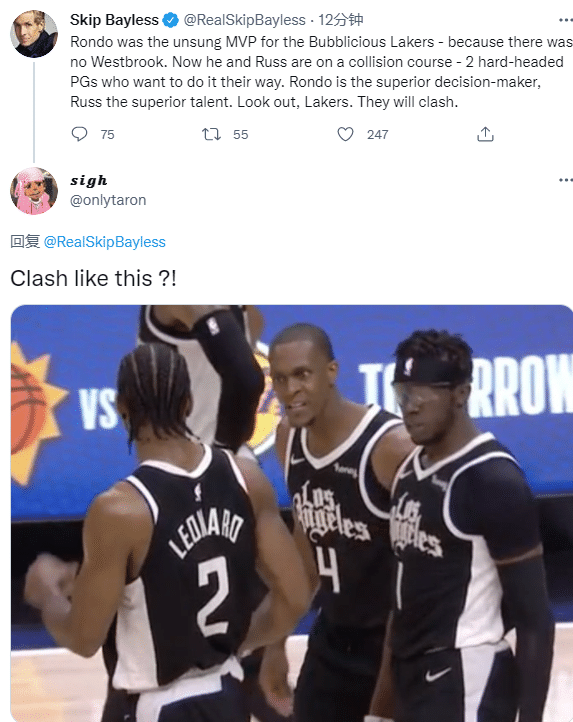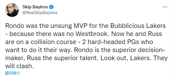 著名詹黑斯基普-贝勒斯发推写道:因为没有威少,朗多是湖人队在复赛园区内默默无名的MVP,现在他和威少正在一个冲突的过程中——2个头脑冷静控卫,都想用他们的方式打比赛。朗多是卓越的决策者,威少是卓越的天才。小心点,湖人队,他们会发生冲突的。