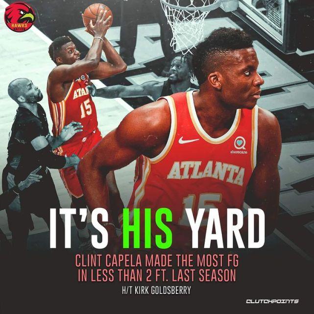 除了抢篮板,卡佩拉在篮下的进攻能力也很突出。离开了哈登的他,依然是吃饼高手,毕竟,新搭档特雷-杨的助攻实力也很强。上赛季,特雷-杨场均助攻9.4次,高居联盟第2位。他的不少助攻,就是喂给了卡佩拉。