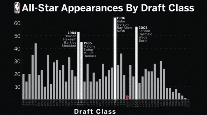 360直播吧8月31日讯 NBA选秀历来是一大关注焦点,各队自然都希望将状元收入囊中。近日一项数据统计出炉,那就是从1966年开始算起至今的各年选秀,其中全明星次数合计总次数来进行一一排序。最后答案揭晓,96届的球员入选全明星次数是最多的,超60次排在第一名。说到96年选秀,球迷们脑海中立马能够浮现几大巨星的名字。科比、艾弗森、纳什等等都是那一届选秀出来的。