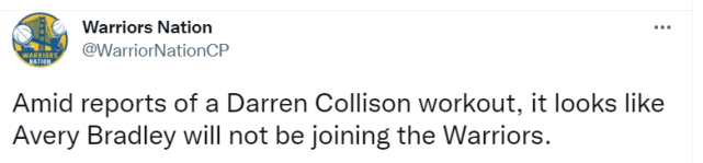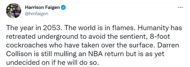 一年多前,湖人记者哈里森-费根见证过科里森“反悔”的一幕,因此得知科里森试训勇士后,他在社媒上调侃道:“2053年,世界陷入一片火海,人类不得不撤退到地下,8英尺的蟑螂统治了地面。达伦-科里森那时候还在犹豫是否回到NBA打球。”