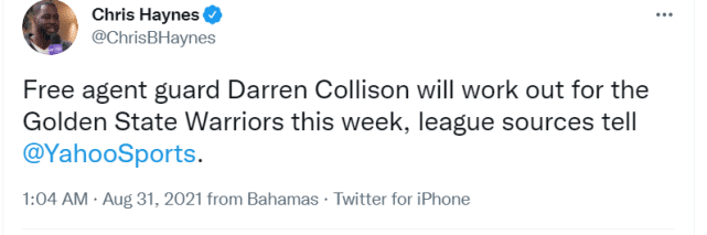 360直播吧8月31日讯 ,据名记克里斯-海耶斯报道,34岁的自由球员达伦-科里森计划在本周为勇士试训。此前,科里森曾和小托马斯、迈克-詹姆斯一起试训过湖人,但湖人最终决定签下朗多。如今,科里森又想到勇士看看有没有重回NBA赛场的机会。