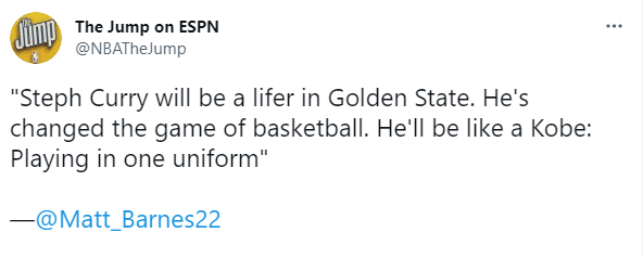 库里前队友马特-巴恩斯表示,斯蒂芬·库里将会终老在金州勇士。他改变了篮球运动。他会像科比一样:仅仅只穿一支球队的球衣。