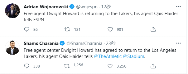 据shams和沃纳罗斯基两大名记同时报道,霍华德已经同意重返湖人,上赛季他为费城76人效力,季后赛第二轮被老鹰淘汰出局;如今他重回湖人,这是霍华德第三次为湖人效力——12-13赛季联手科比打了一年;19-20赛季重返湖人,联手詹姆斯并且帮助湖人夺得队史第17冠,现在魔兽又回来了,新赛季帮助湖人冲击队史第18冠。
